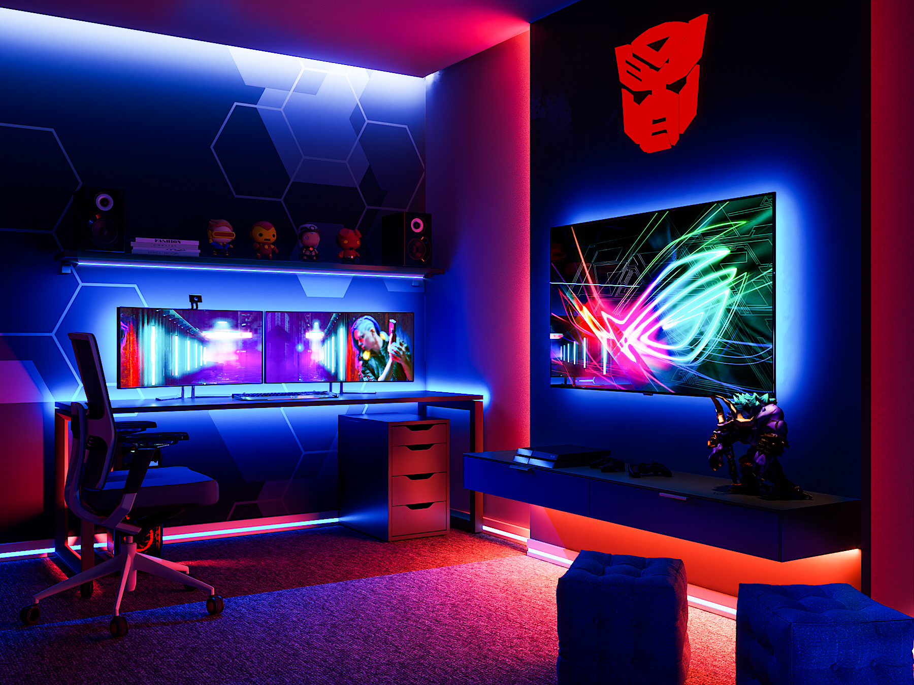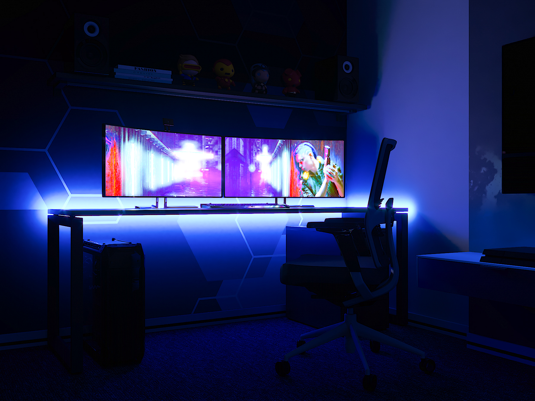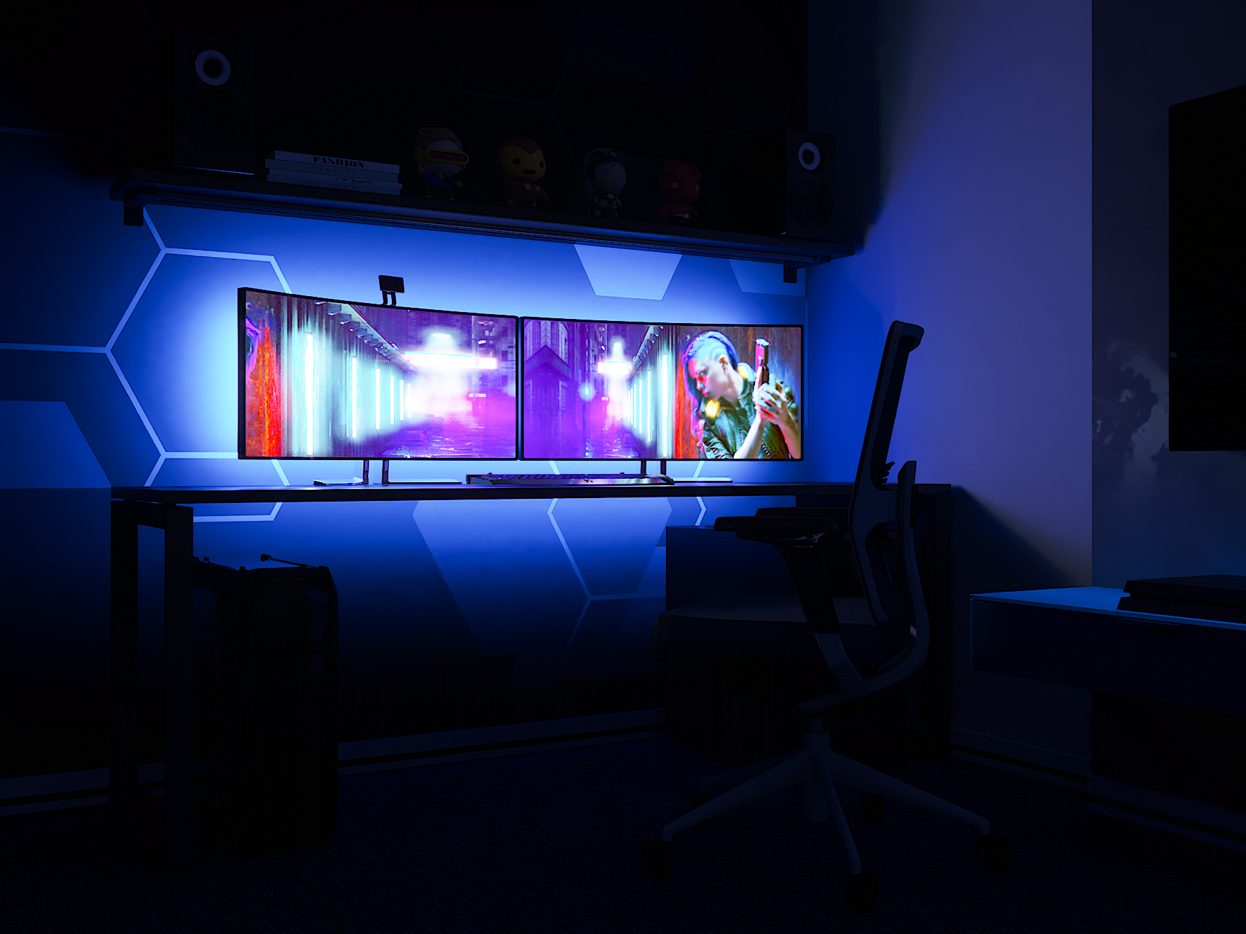 Der Computertisch ist das Zentrum des Gaming-Rooms. Hier steht der Computer oder die Spielekonsole und es finden alle wesentlichen Aktivitäten statt, die der Spieler ausführt. Daher ist es nicht nur wichtig, dass ausreichend Licht vorhanden ist, sondern auch die passende Atmosphäre herrscht. Je nach Geschmack kann man die Beleuchtung dimmen oder die Farbe wechseln. Wenn die Farben nicht kräftig genug erscheinen ist es zusätzlich möglich, die Farbsättigung einzustellen.