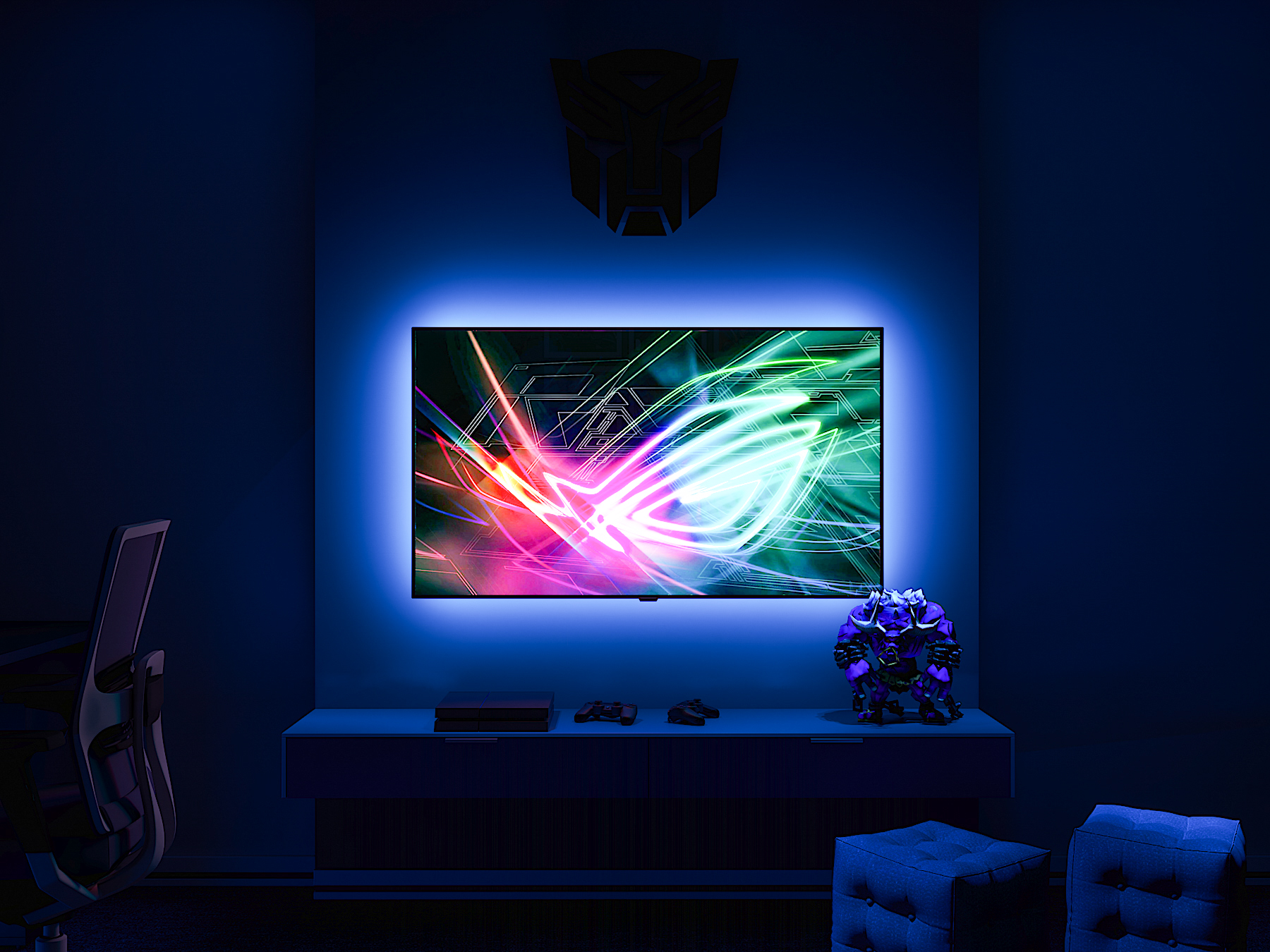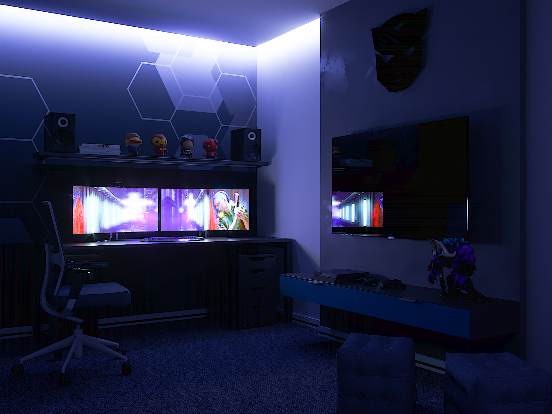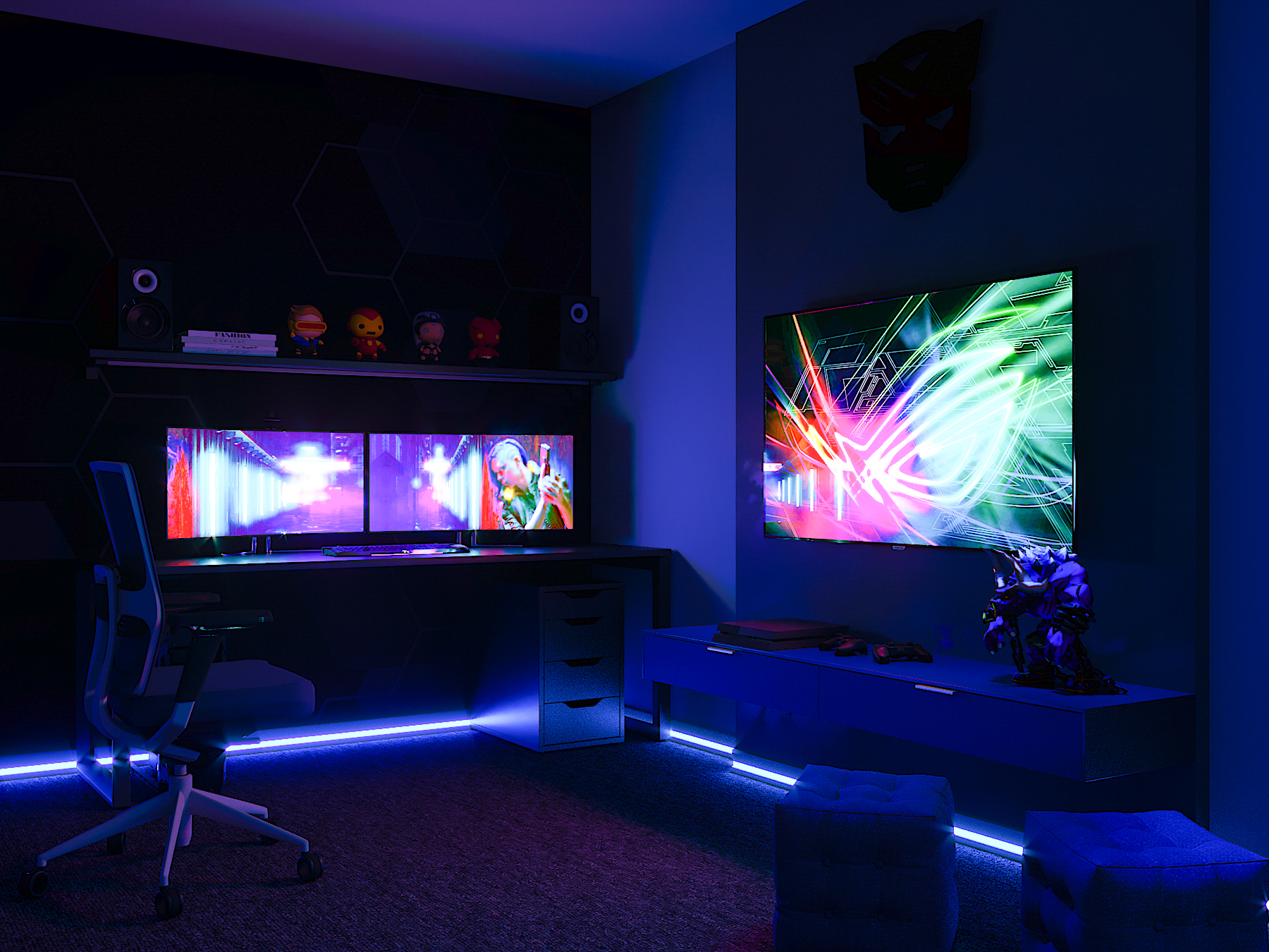 Der Computertisch ist das Zentrum des Gaming-Rooms. Hier steht der Computer oder die Spielekonsole und es finden alle wesentlichen Aktivitäten statt, die der Spieler ausführt. Daher ist es nicht nur wichtig, dass ausreichend Licht vorhanden ist, sondern auch die passende Atmosphäre herrscht. Je nach Geschmack kann man die Beleuchtung dimmen oder die Farbe wechseln. Wenn die Farben nicht kräftig genug erscheinen ist es zusätzlich möglich, die Farbsättigung einzustellen.